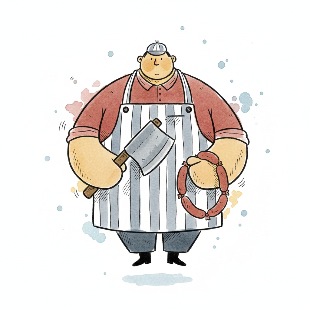 Cartoon-Metzger mit Beil und Würsten in gestreifter Schürze, Aquarell-Illustration.