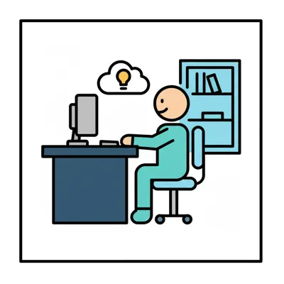 Stilisierte Person arbeitet am Computer, hat eine Idee (Glühbirne in Wolke), im Büro mit Bücherregal.