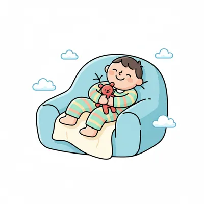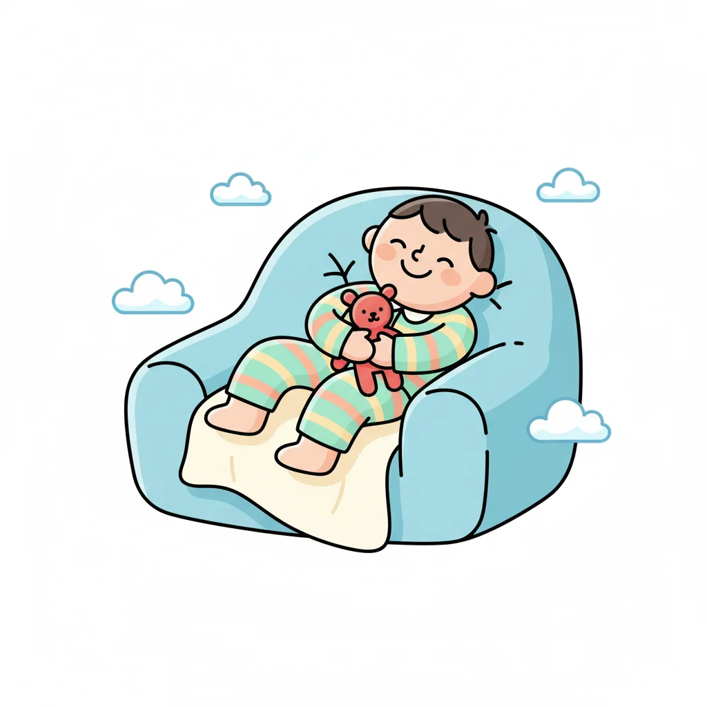 Glückliches Baby in Pyjamas kuschelt mit Teddybär im blauen Sessel, umgeben von Wolken.