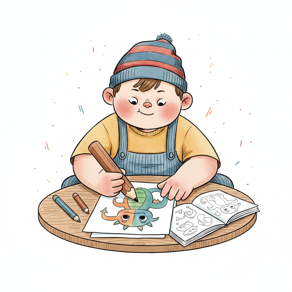 Ein lächelnder Junge malt ein Eichhörnchen mit einem blauen Stift an einem Holztisch.