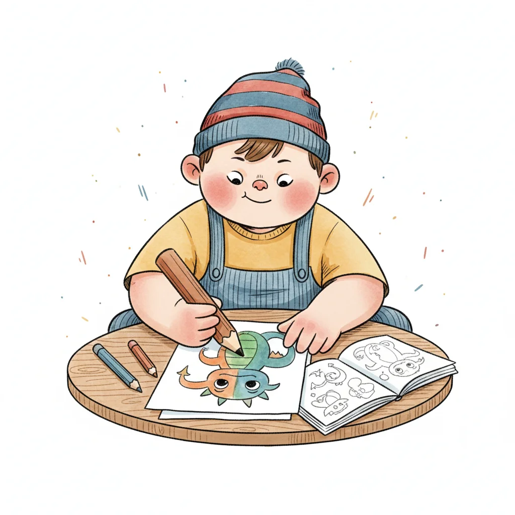 Niedliches Kind in Mütze und Latzhose malt ein Drachenbild mit Buntstiften an einem Tisch.