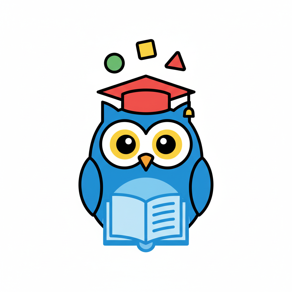 Blaue Cartoon-Eule mit Doktorhut liest Buch, umgeben von geometrischen Formen.