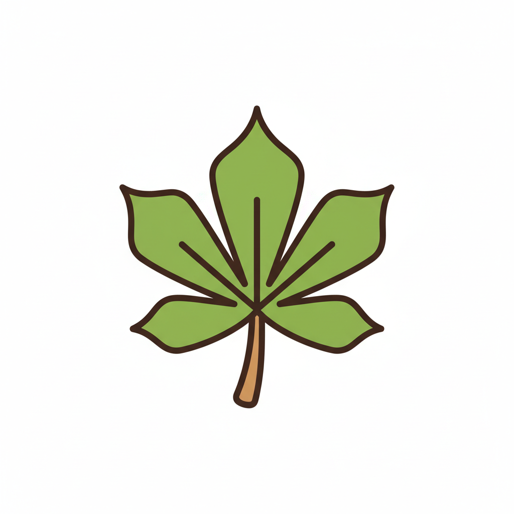 Grünes, stilisiertes Blatt mit fünf Lappen und braunem Stiel auf weißem Hintergrund.