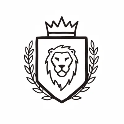 Schwarz-weiße Illustration eines Löwenkopfes in einem Schild mit Krone und Lorbeerkranz.