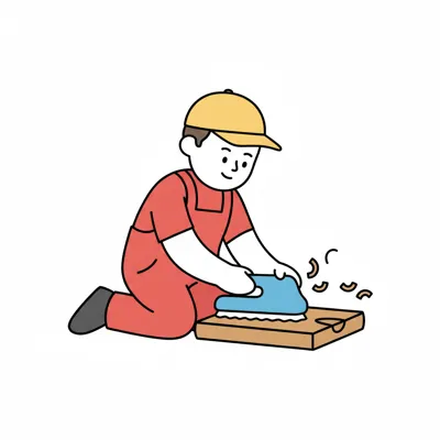 Ein Handwerker in rotem Overall und gelber Kappe hobelt ein Holzbrett, Späne fliegen.