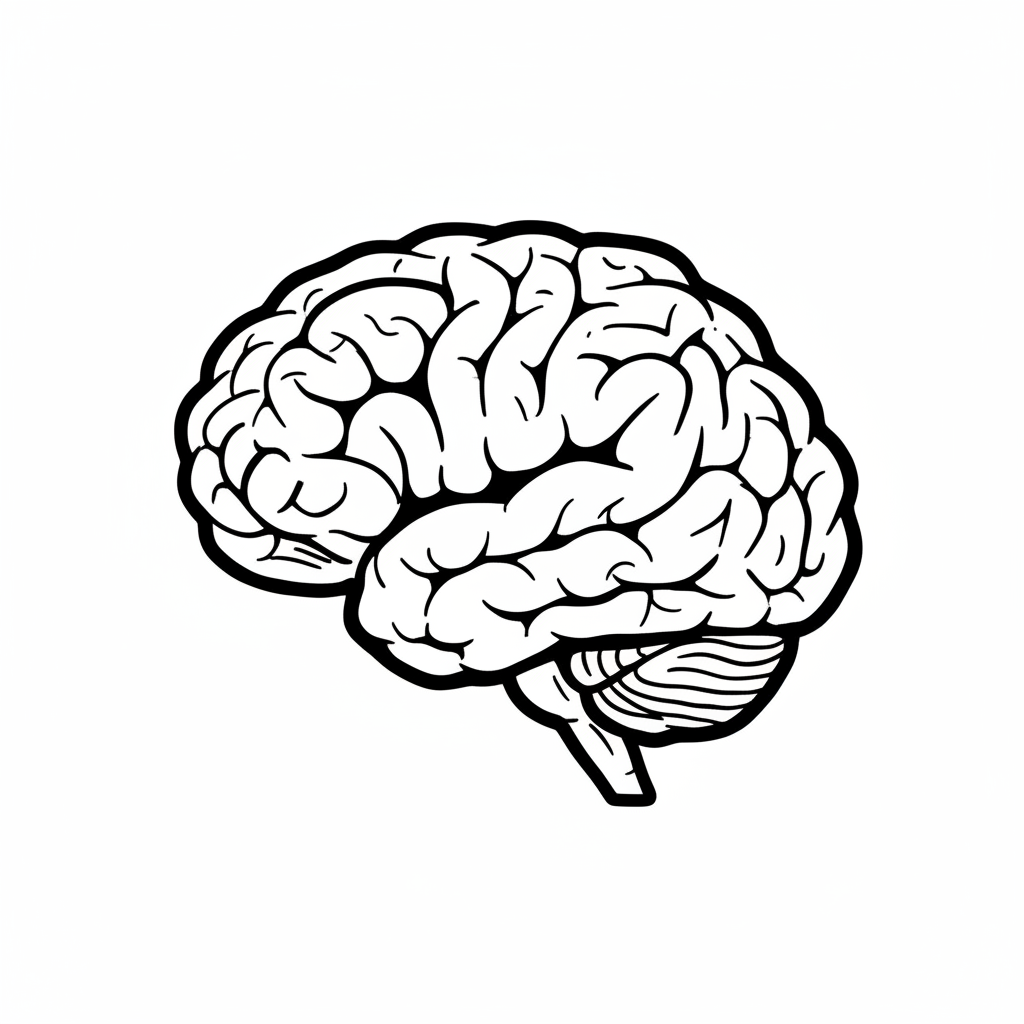 Schwarz-weiße Seitenansicht eines menschlichen Gehirns als einfache Strichzeichnung.