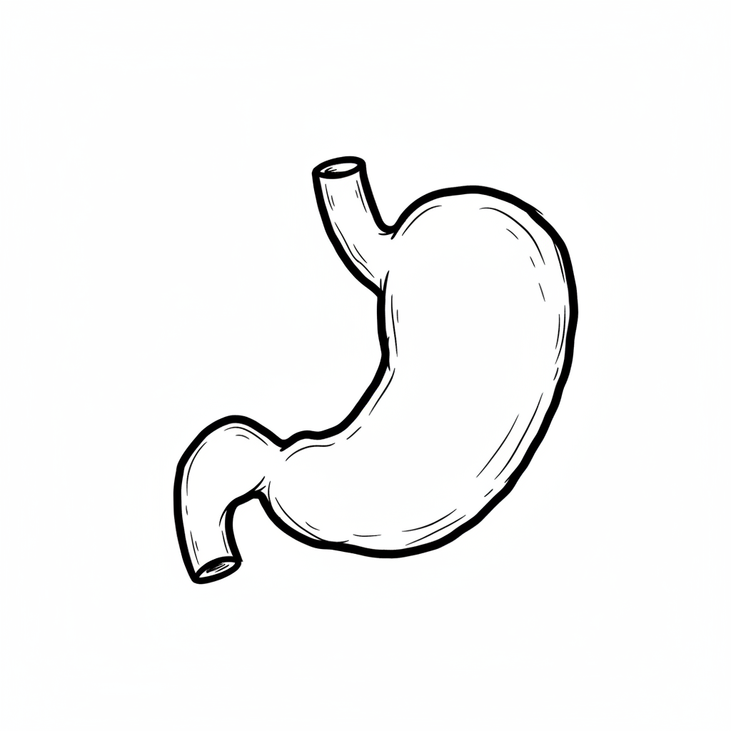 Schwarz-weiße Skizze eines menschlichen Magens, isoliert auf weißem Hintergrund.
