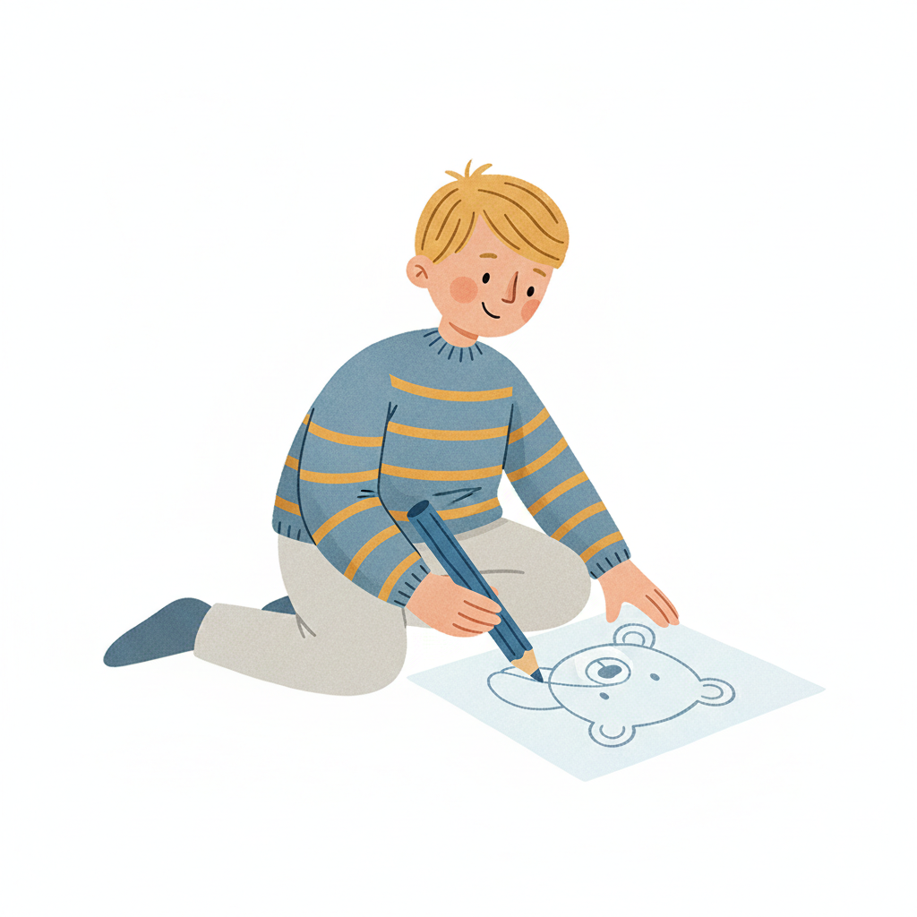 Ein lächelnder Junge sitzt auf dem Boden und zeichnet mit einem Bleistift einen Bären.