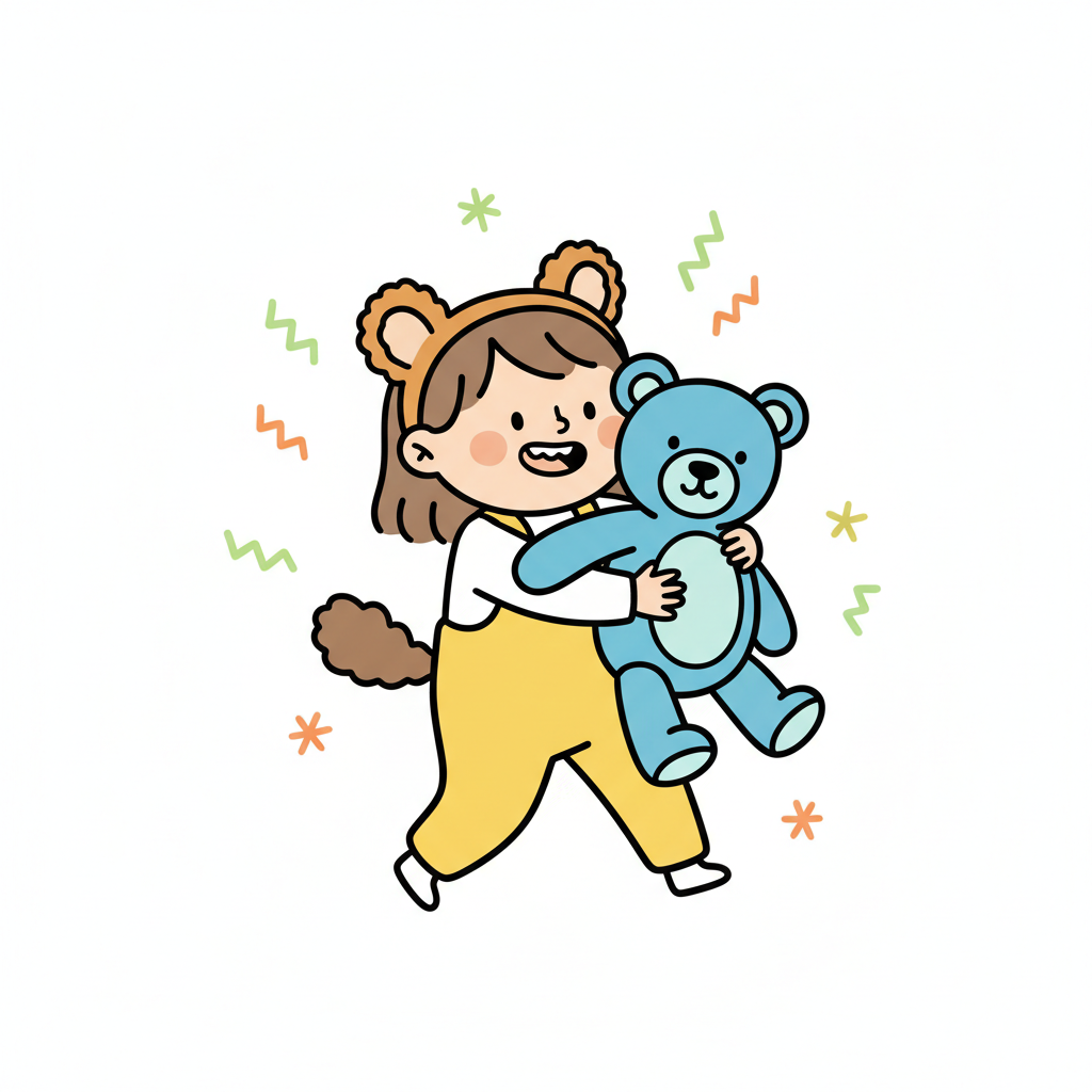 Ein lächelndes Cartoon-Kind in roten Latzhosen sitzt und hält einen abgenutzten Teddybären.