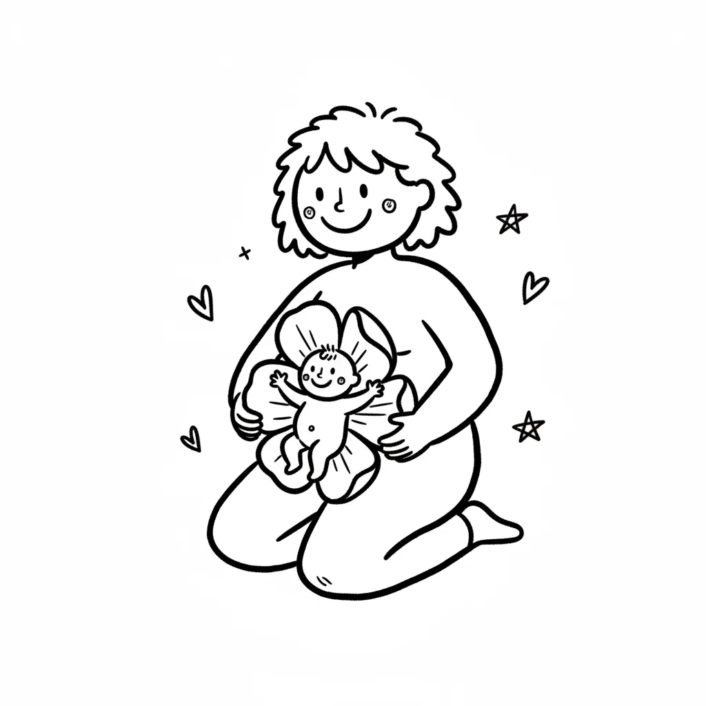 Glückliche Mutter hält lächelndes Baby in einer Blume, umgeben von Herzen und Sternen.