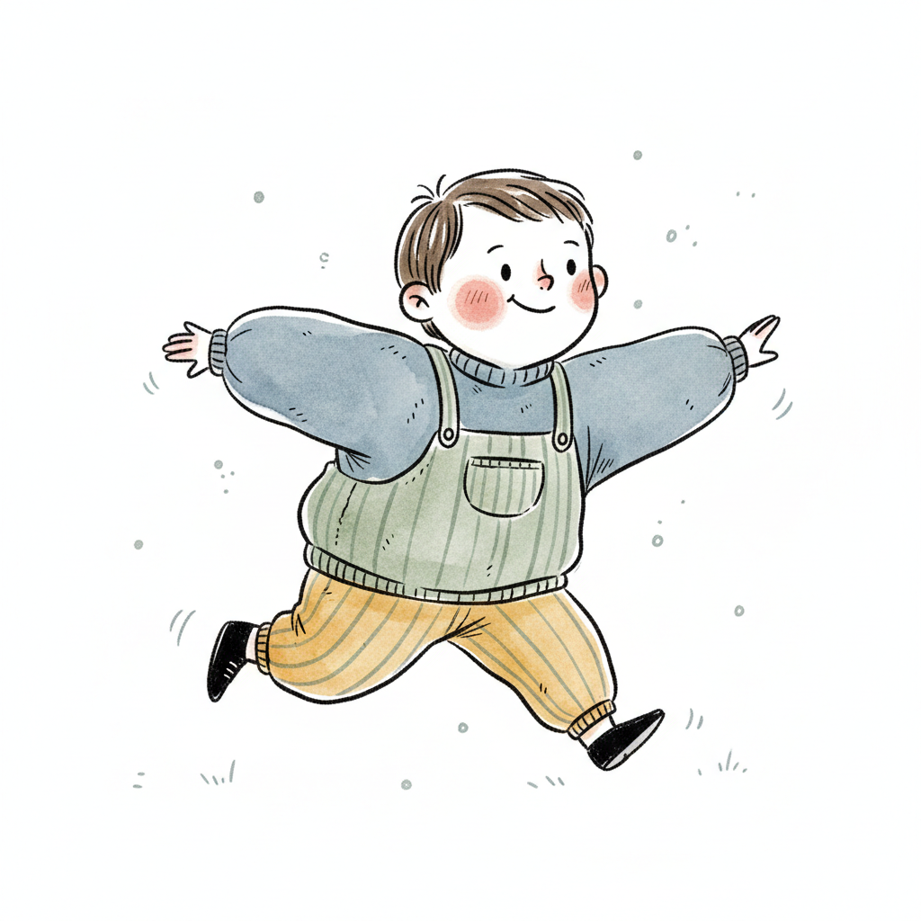 Glücklicher Cartoon-Junge mit roten Wangen rennt oder springt in Latzhose und Pullover.