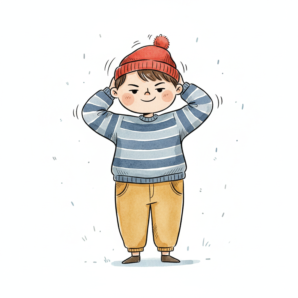 Niedlicher Cartoon-Junge mit roter Mütze und gestreiftem Pullover, der fröhlich seine Mütze richtet.