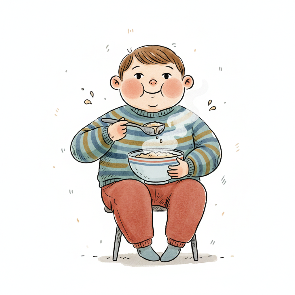 Ein pummeliger Cartoon-Junge isst genüsslich dampfenden Brei aus einer Schüssel.