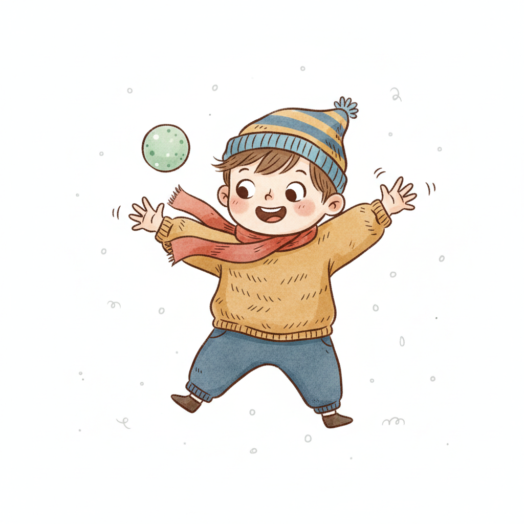 Fröhlicher Cartoon-Junge in Winterkleidung spielt mit einem Ball im Schnee.