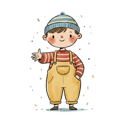 Niedlicher Cartoon-Junge in Latzhose und Mütze, lächelnd und winkend.