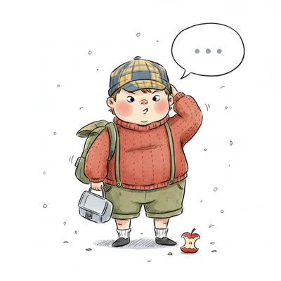 Nachdenklicher Cartoon-Junge mit Rucksack, Brotdose und Apfelrest am Boden.
