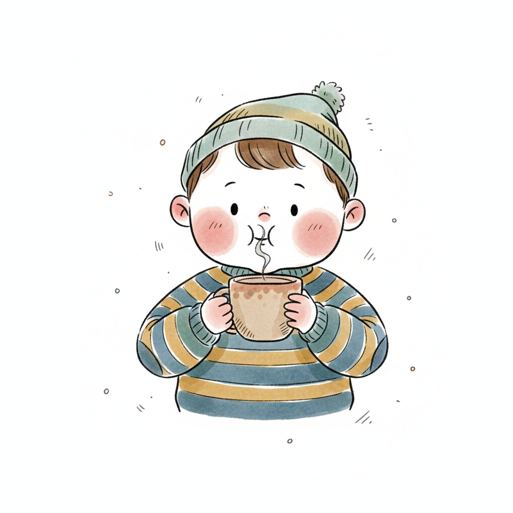 Ein Junge mit Mütze trinkt warmen Tee und genießt den Dampf.
