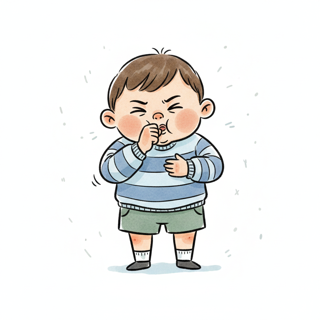 Ein Cartoon-Kind hustet oder niest und bedeckt den Mund mit der Hand.