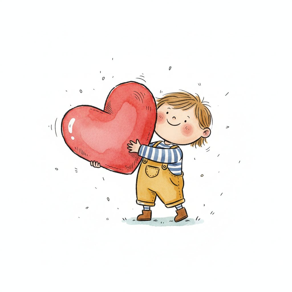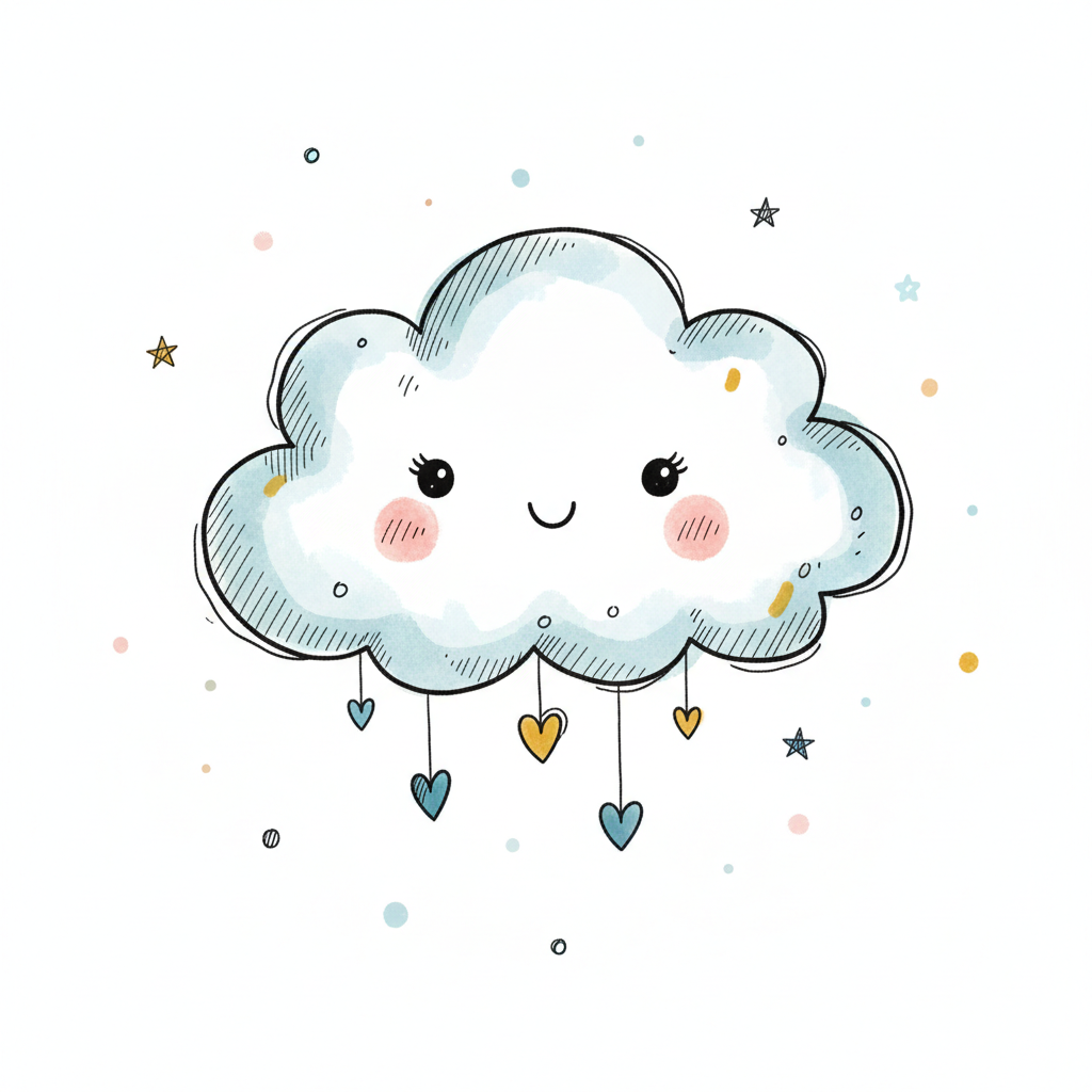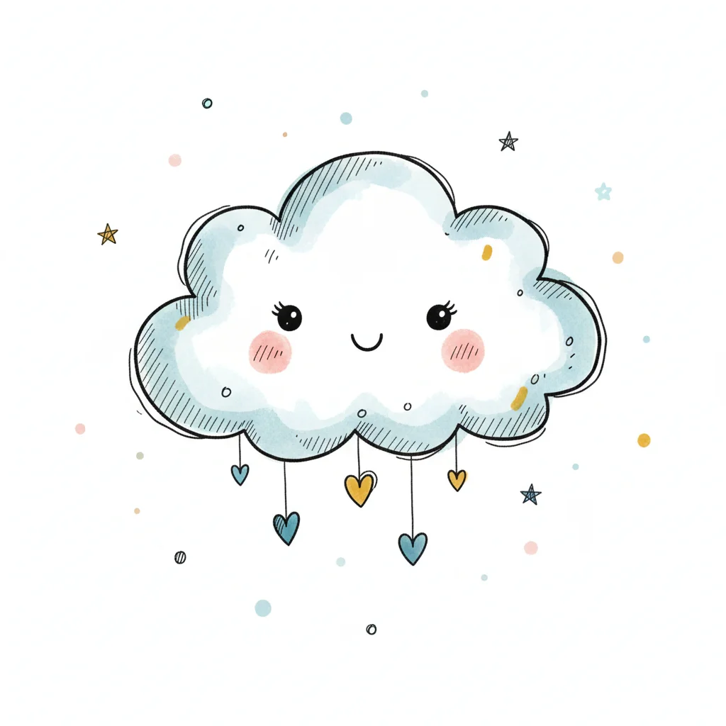 Süße Wolke mit Gesicht und Herzen, in sanften Farben gezeichnet.