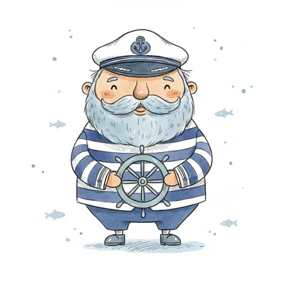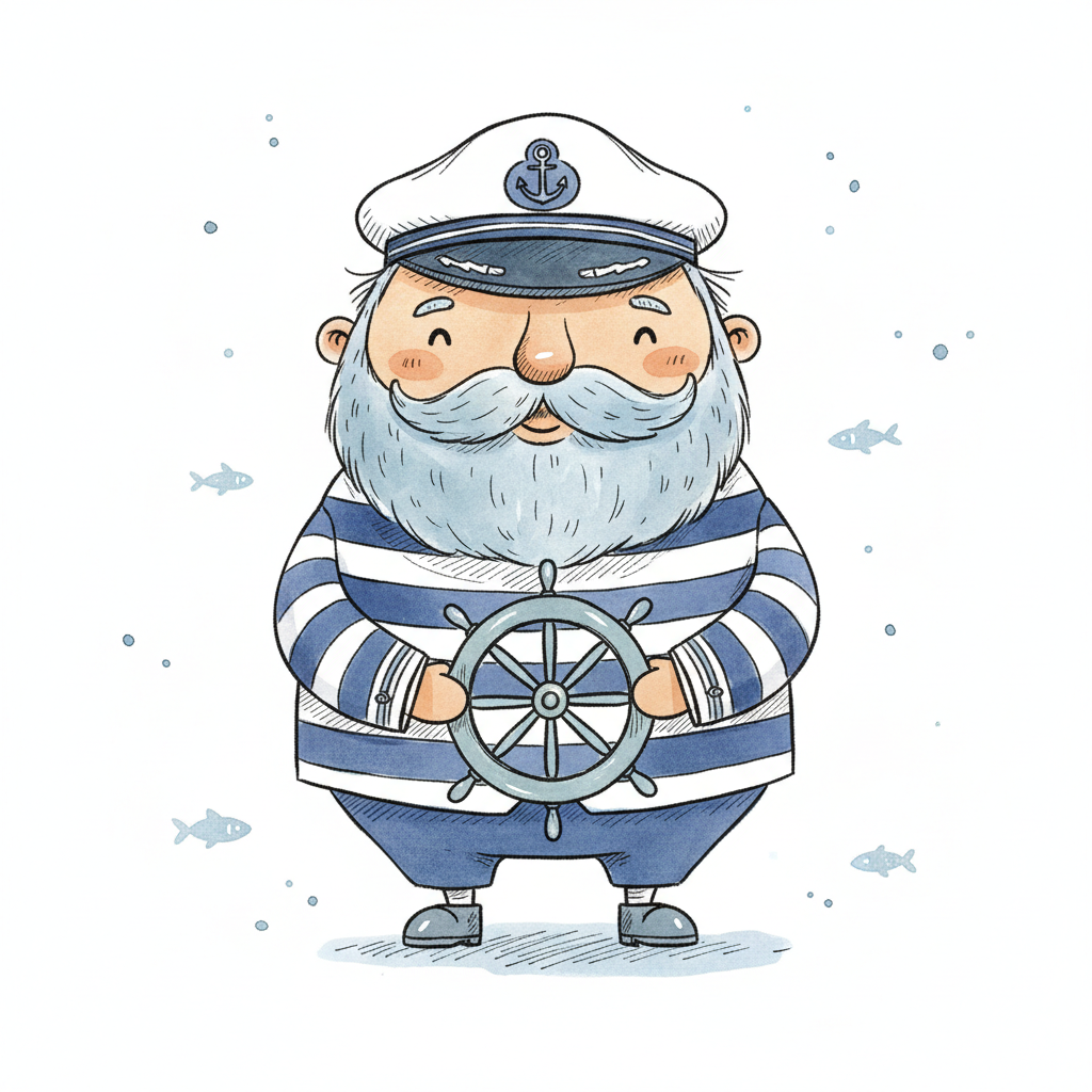 Ein fröhlicher Kapitän mit einem Steuerrad in maritimer Kleidung.