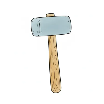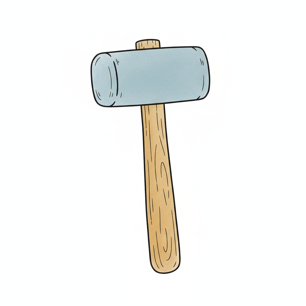 Cartoon-Stil Schonhammer mit hellblauem Kopf und braunem Holzgriff auf weißem Hintergrund.