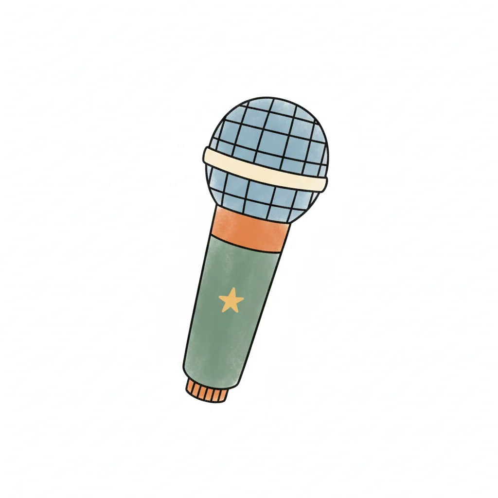 Buntes, gezeichnetes Mikrofon mit blauem Gitterkopf und einem gelben Stern auf dem grünen Griff.