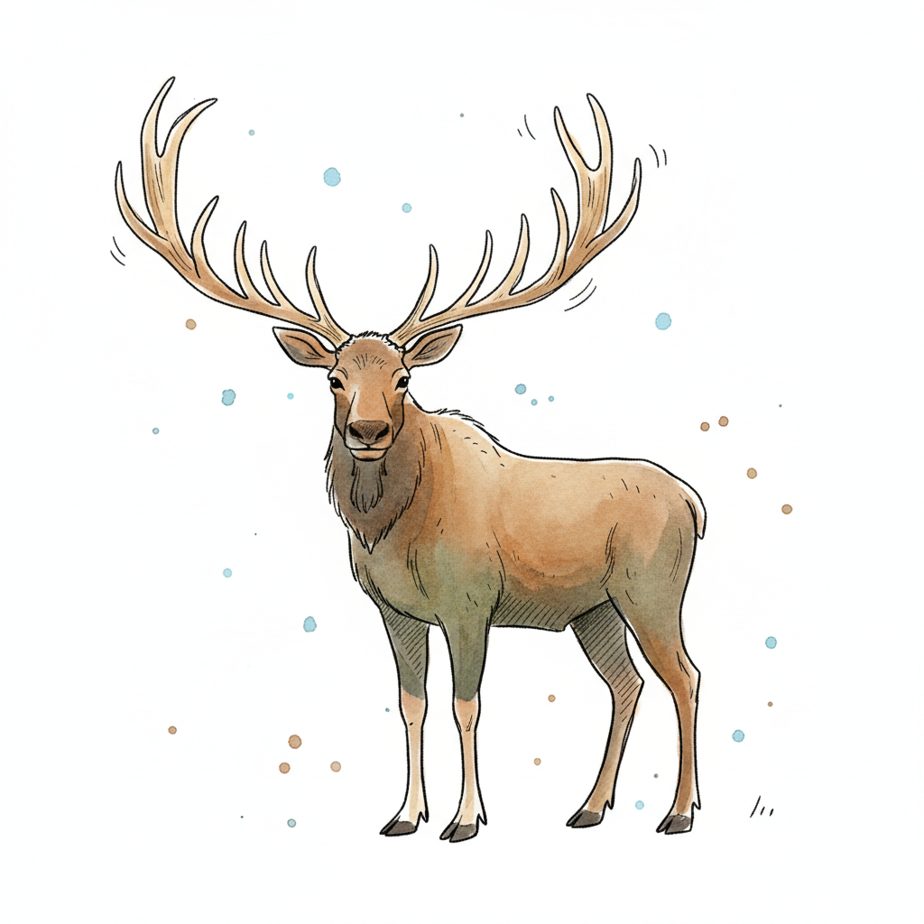 Aquarell-Illustration eines Elchs mit großem Geweih auf weißem Hintergrund.