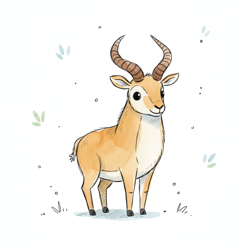 Niedliche, gezeichnete Antilope in Aquarell-Optik mit großen Augen und Hörnern auf weißem Grund.