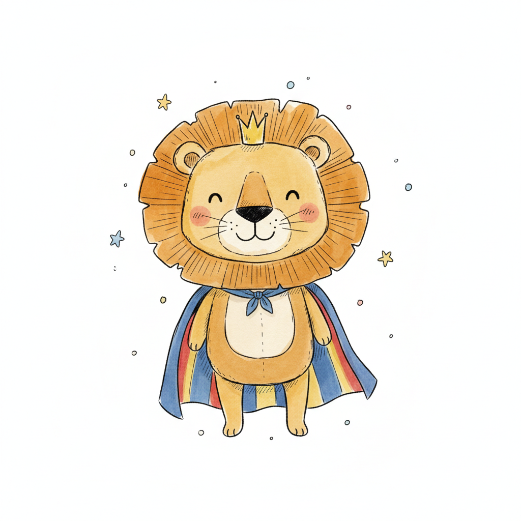 Ein fröhlicher Löwe in einem Umhang mit einer Krone, umgeben von Sternen.