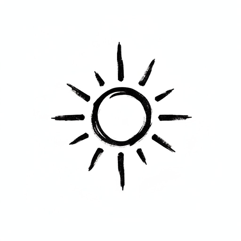 Schlichte Sonne mit Strahlen, künstlerisch in Schwarz dargestellt.