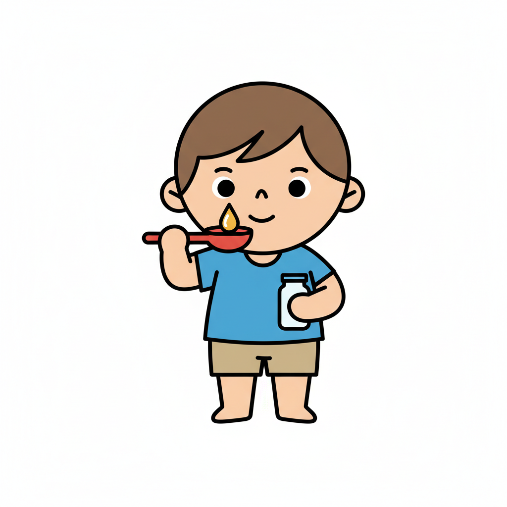 Ein Junge hält einen Löffel und eine Flasche. Er lächelt.
