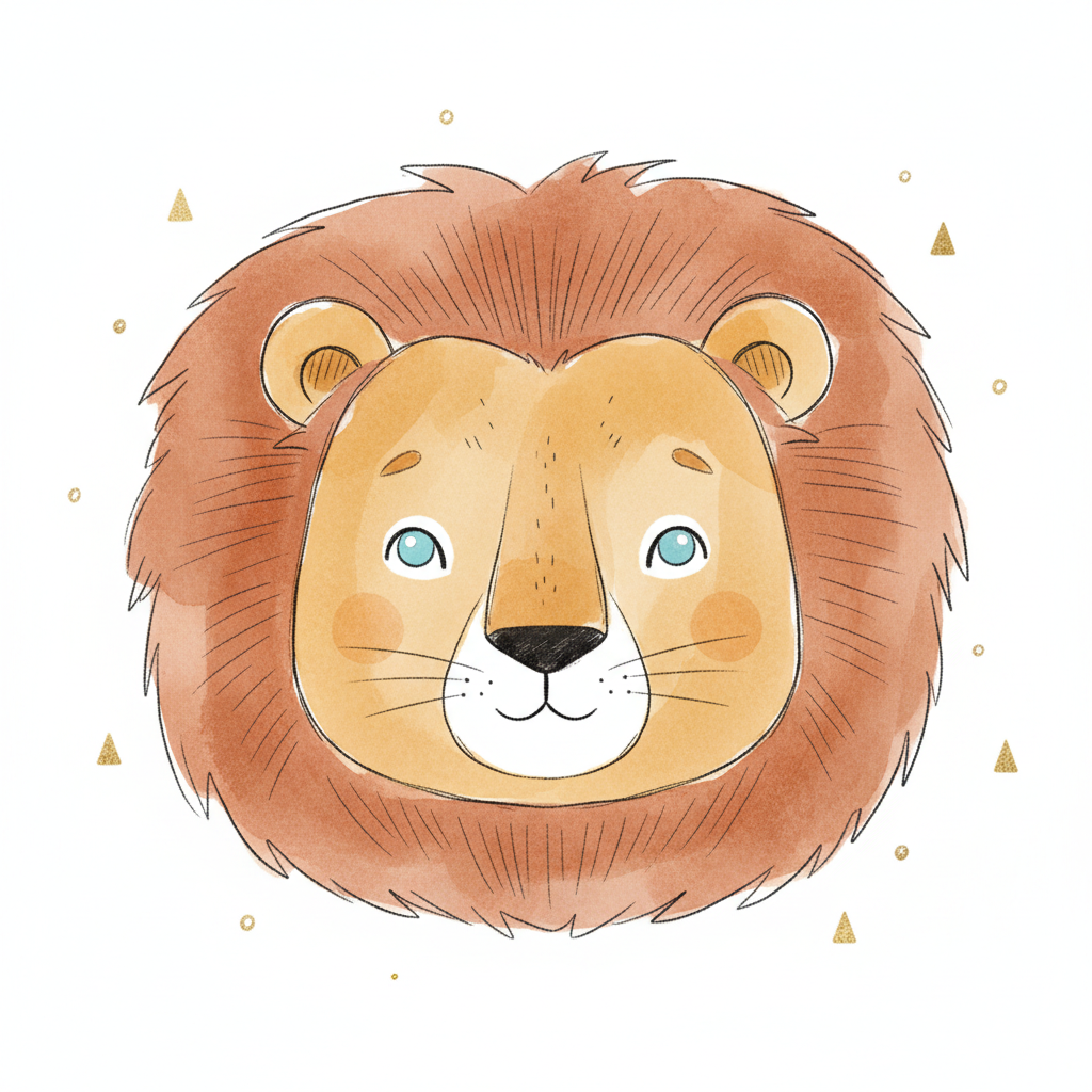 Niedlicher Löwenkopf mit freundlichem Gesicht und goldenen Akzenten.