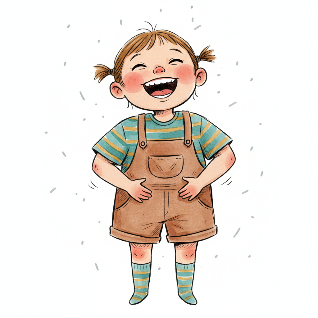 Fröhliches Kind mit Zöpfen, gestreiftem Shirt und Latzhose, das lacht.