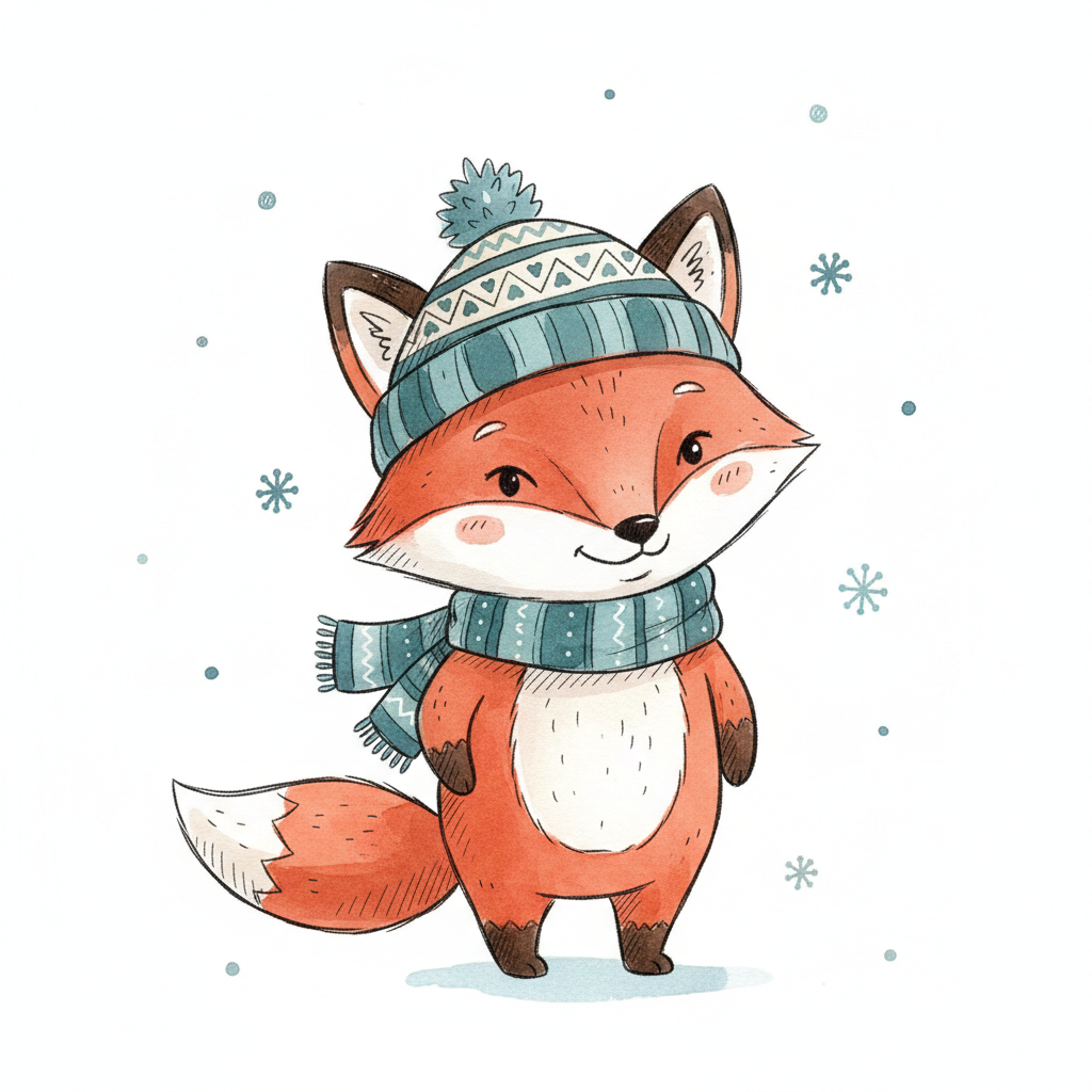 Niedlicher Fuchs mit Mütze und Schal im Winter, umgeben von Schneeflocken.