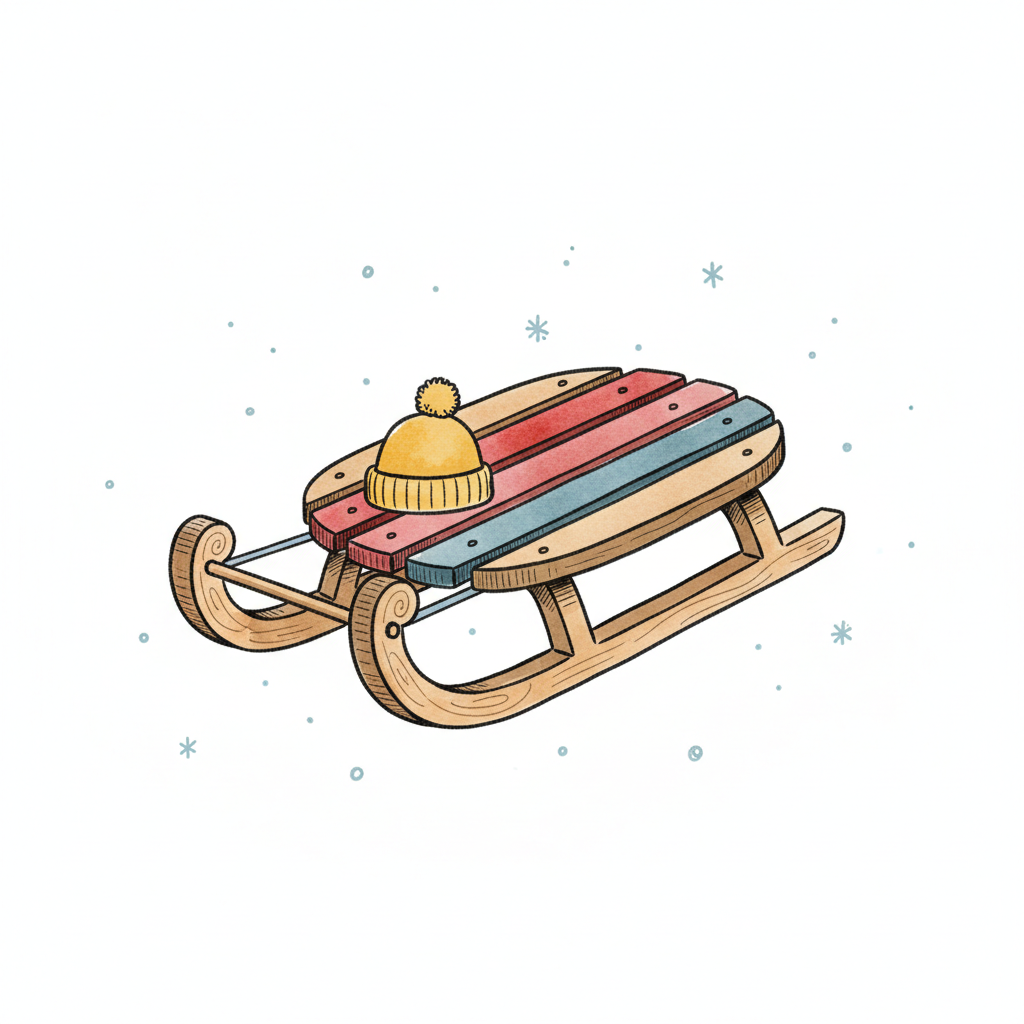 Bunter Holzschlitten mit gelber Mütze und Schneeflocken im Aquarellstil.
