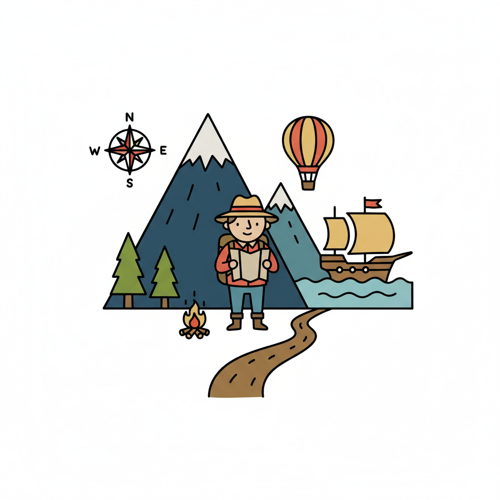 Cartoon eines Reisenden mit Karte vor Bergen, Bäumen, Lagerfeuer, Schiff und Heißluftballon.