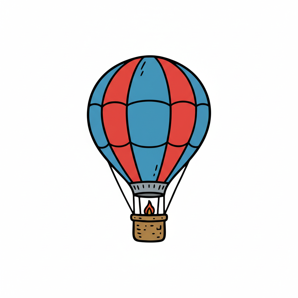 Illustrierter Heißluftballon in Rot und Blau mit brennender Flamme im Korb auf weißem Grund.