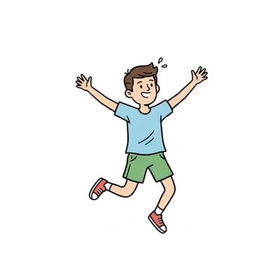 Fröhlicher Cartoon-Junge springt mit erhobenen Armen und lachendem Gesicht in die Luft.