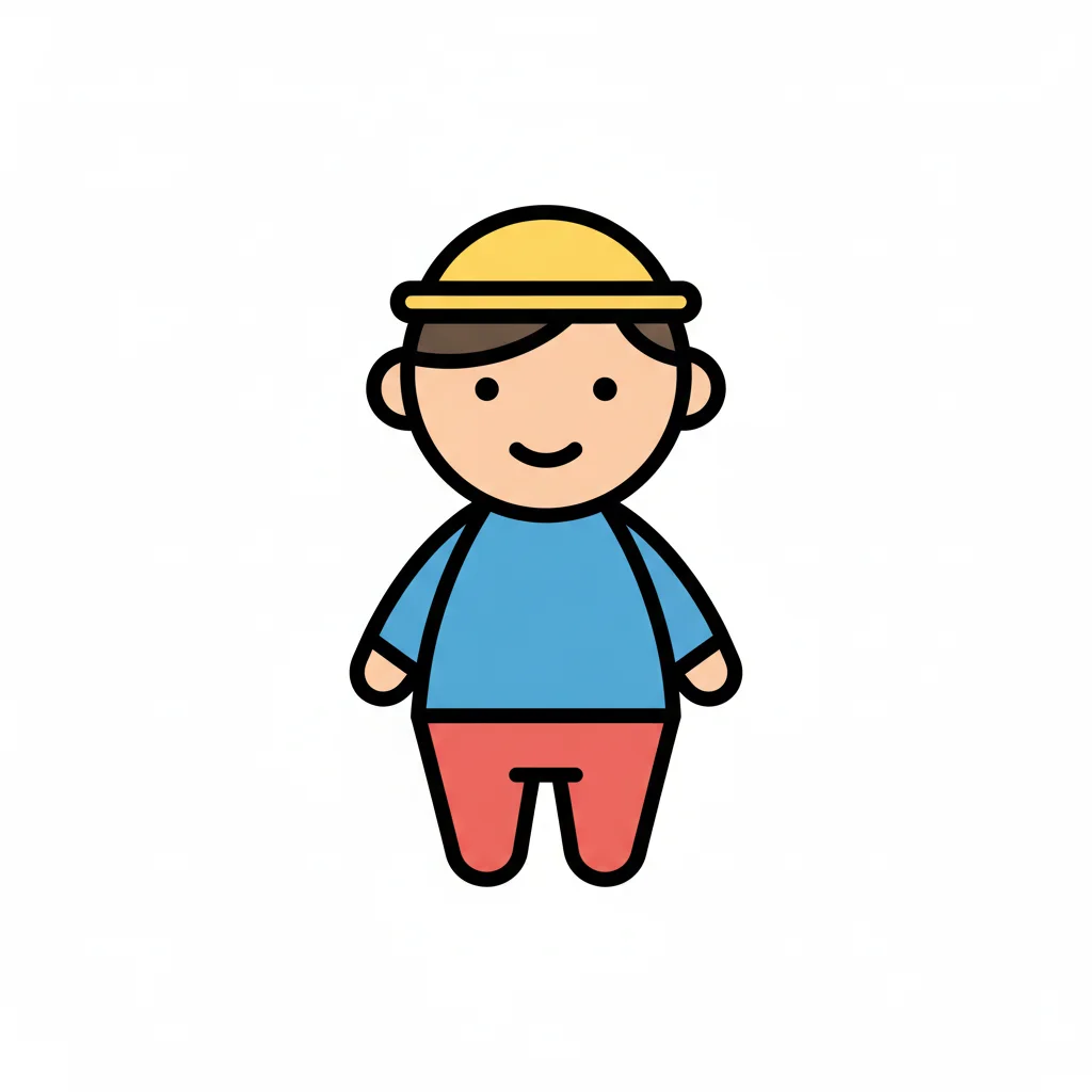 Ein cartoonartiger Junge mit gelber Mütze und buntem Outfit.