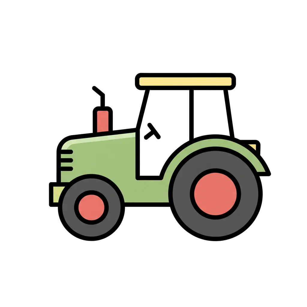 Grüner Traktor-Icon im Flat-Design mit roten Rädern und gelbem Dach auf weißem Hintergrund.