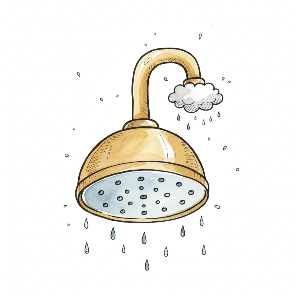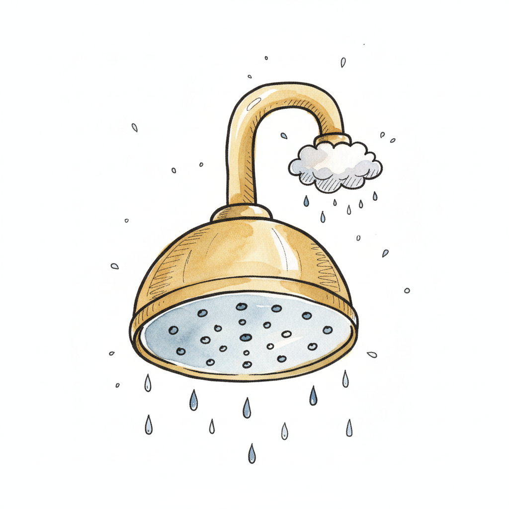 Goldene Cartoon-Duschbrause mit Wassertropfen und kleiner Wolke, Aquarellstil.