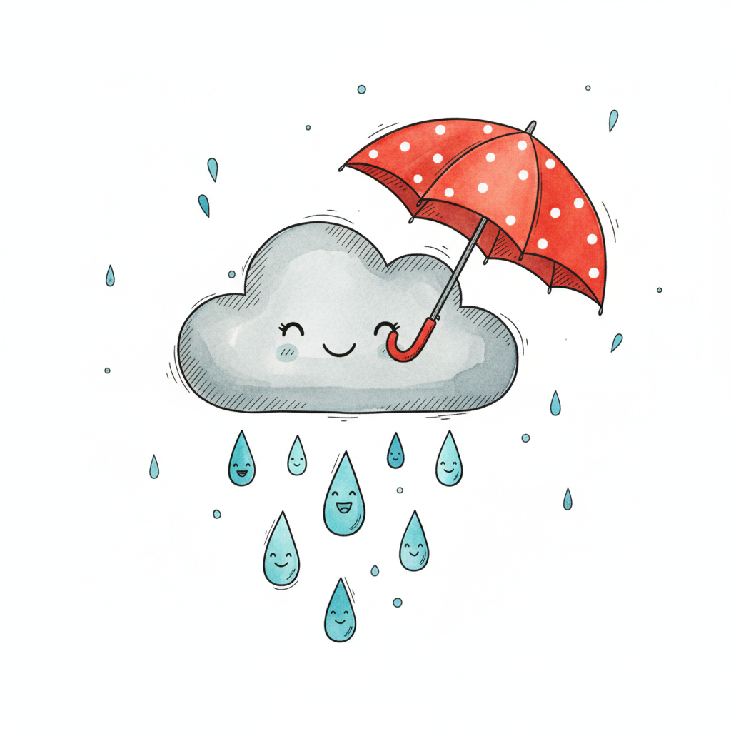 Eine fröhliche Wolke mit einem Regenschirm und Regentropfen.
