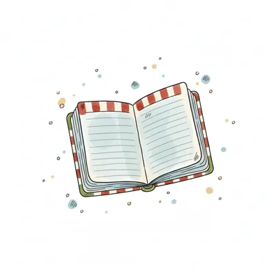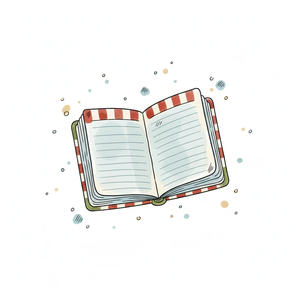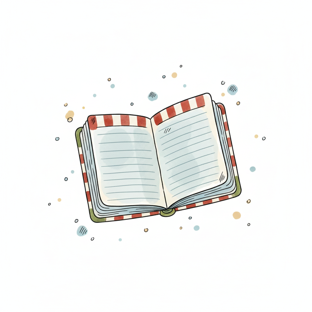 Ein geöffnetes Notizbuch mit gestreiftem Einband und leeren Seiten.