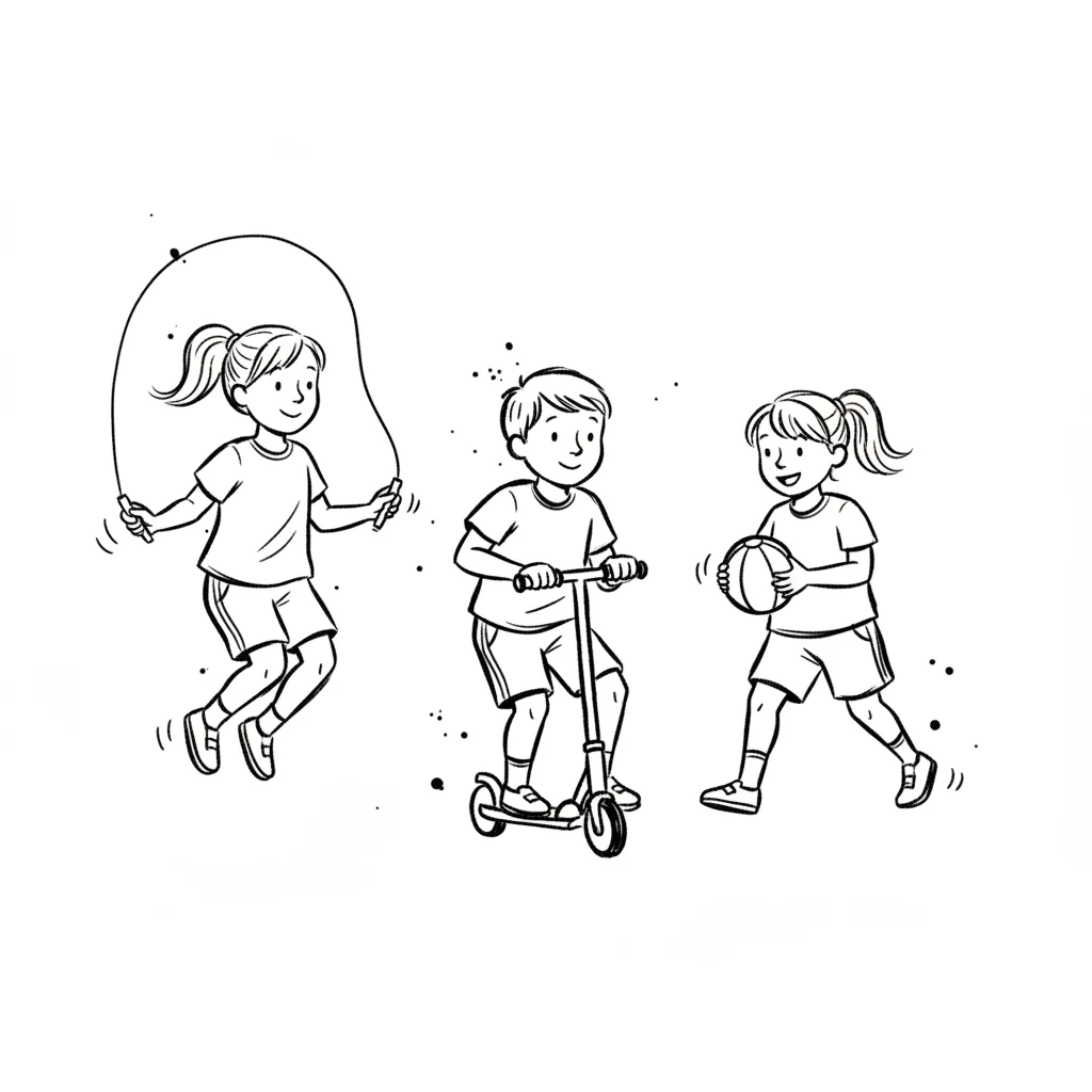 Drei Kinder spielen: Ein Mädchen springt Seil, ein Junge fährt Roller, ein Mädchen hält einen Ball.