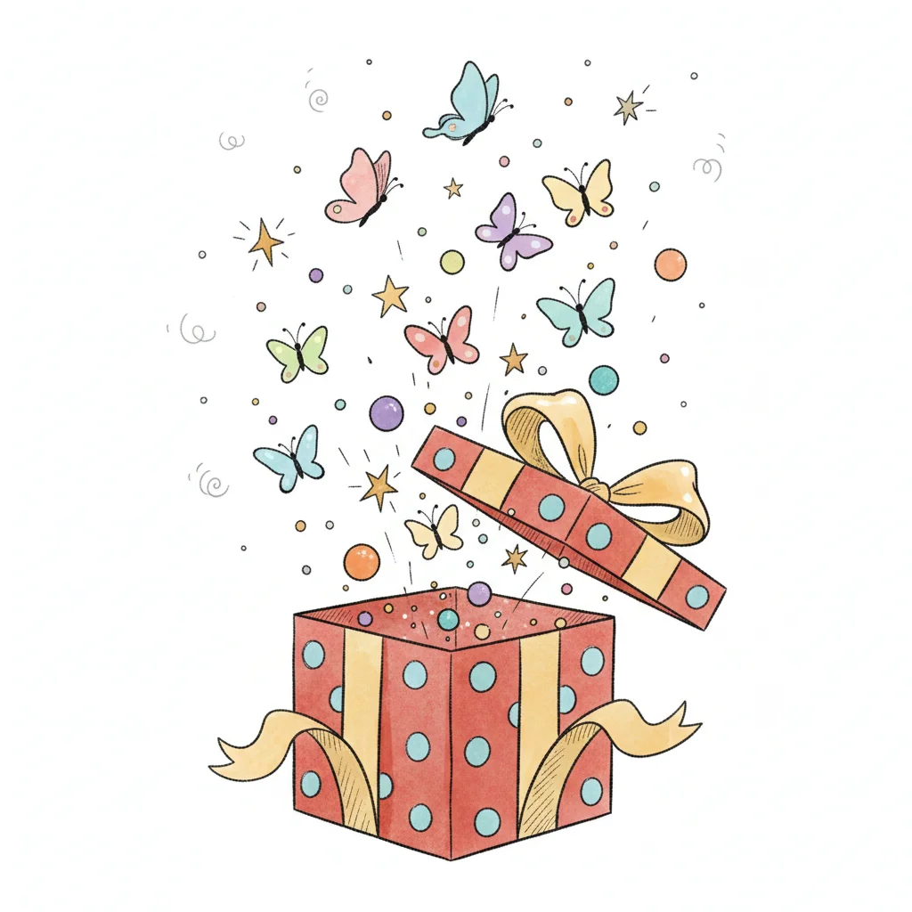 Ein Geschenk mit bunten Schmetterlingen und Sternen im Himmel.