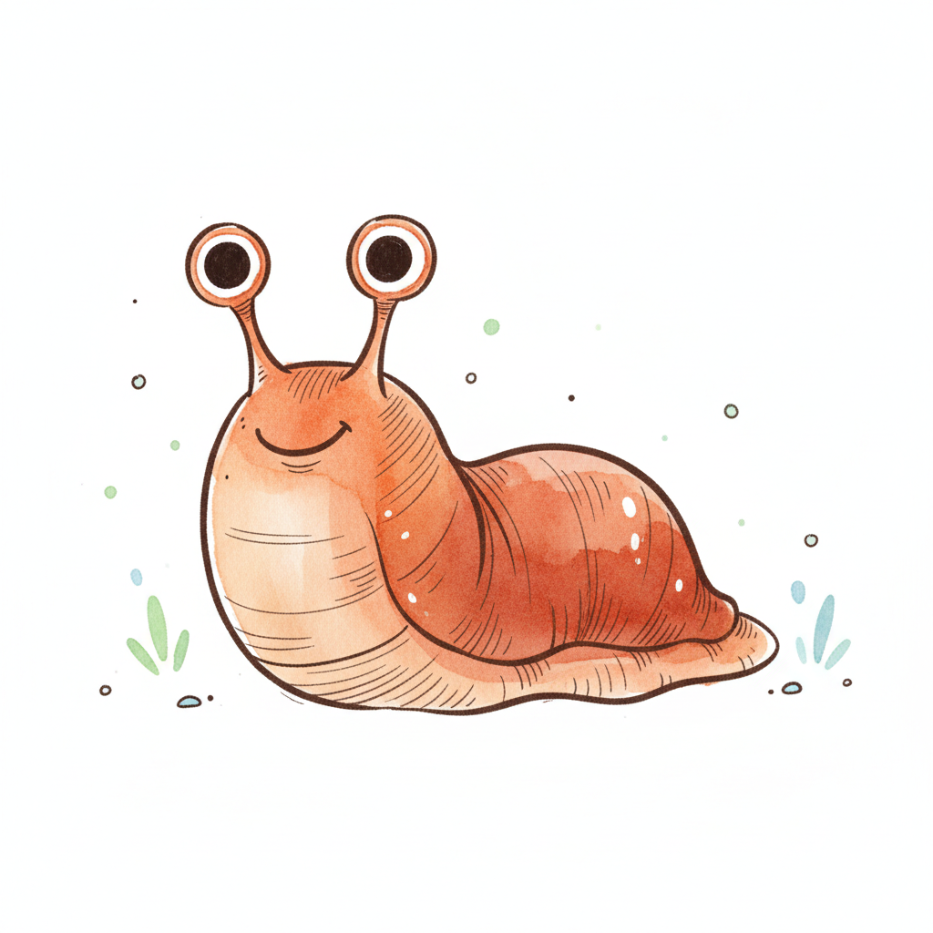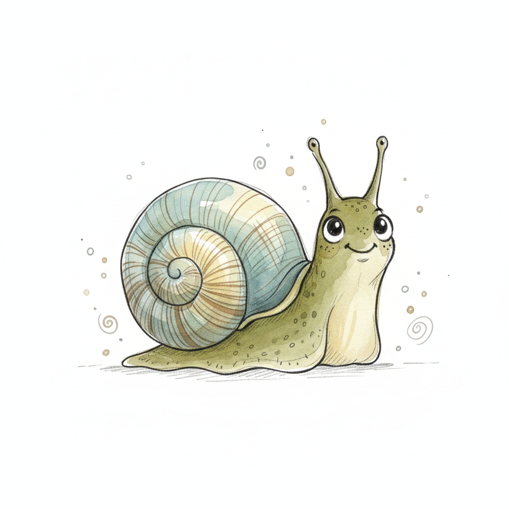 Eine niedliche, cartoonartige Schnecke mit großen Augen und einem freundlichen Ausdruck.