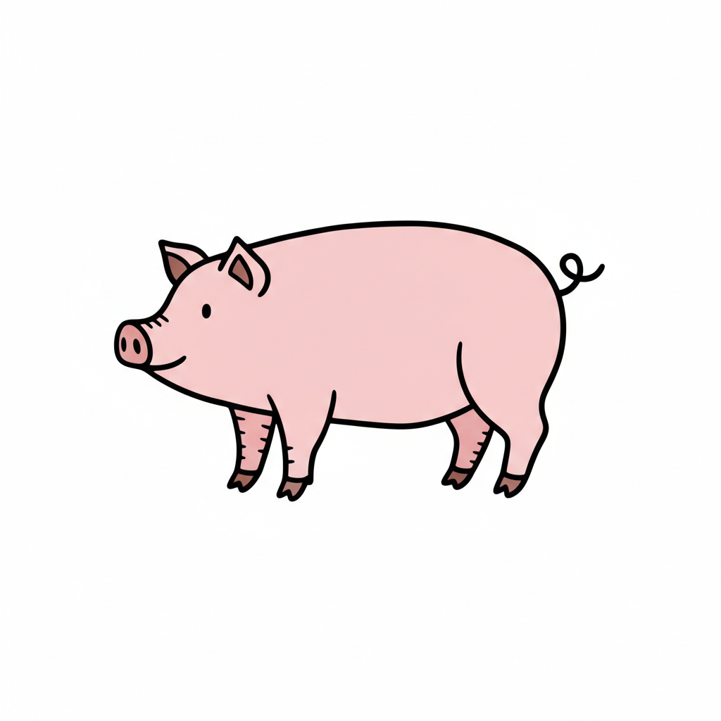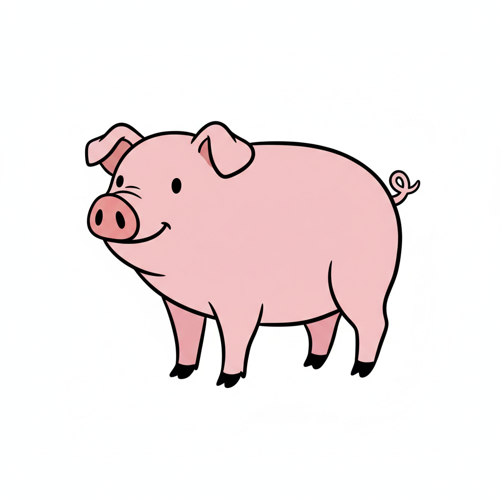 Ein gezeichnetes, fröhliches, rosa Schwein steht seitlich.