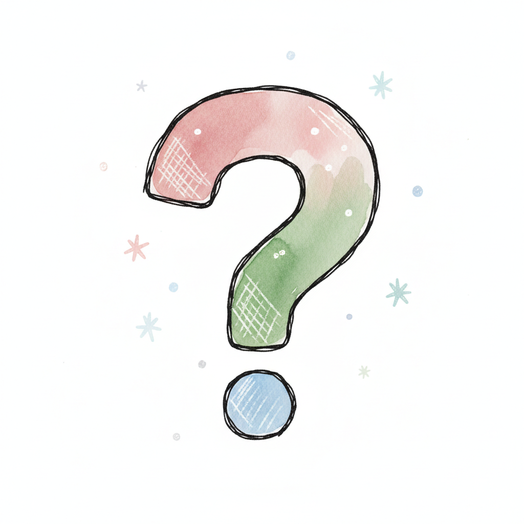 Buntes Fragezeichen im Aquarellstil mit skizzenhafter Umrandung auf weißem Hintergrund.