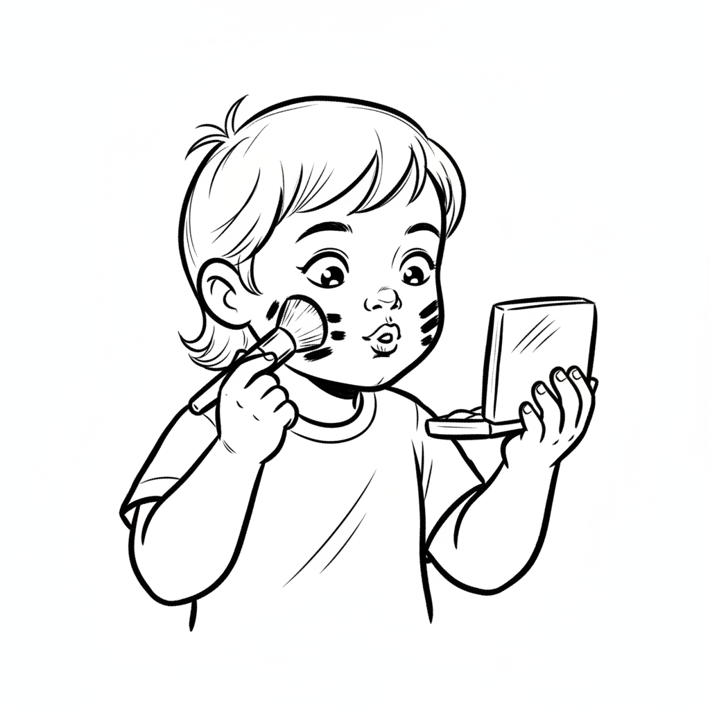 Kleines Kind schminkt sich mit Pinsel und Spiegel, hat schwarze Streifen im Gesicht.