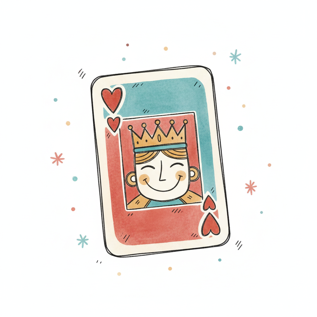 Eine farbenfrohe Spielkarte mit einem lächelnden König und Herzsymbolen.